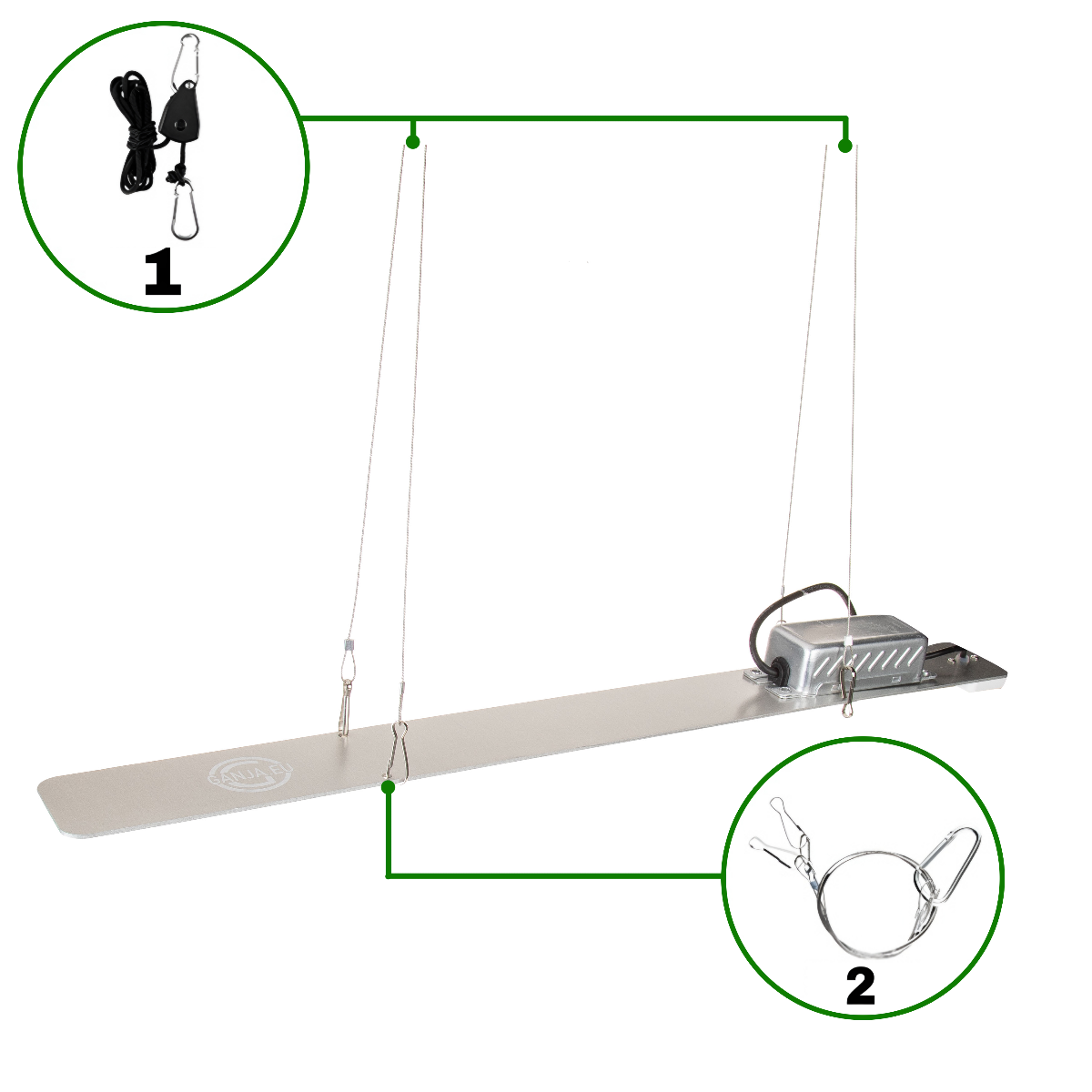 Our lights come with steel cables that connect at one point to a fabric cable, which in turn is equipped with a quick suspension height adjustment system. This allows you to quickly select the appropriate suspension height for your plant's current growth stage.